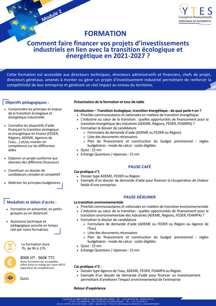 - Module 2 : Comment faire financer vos projets d’investissements industriels en lien avec la transition écologique et énergétique en 2021-2027 ?