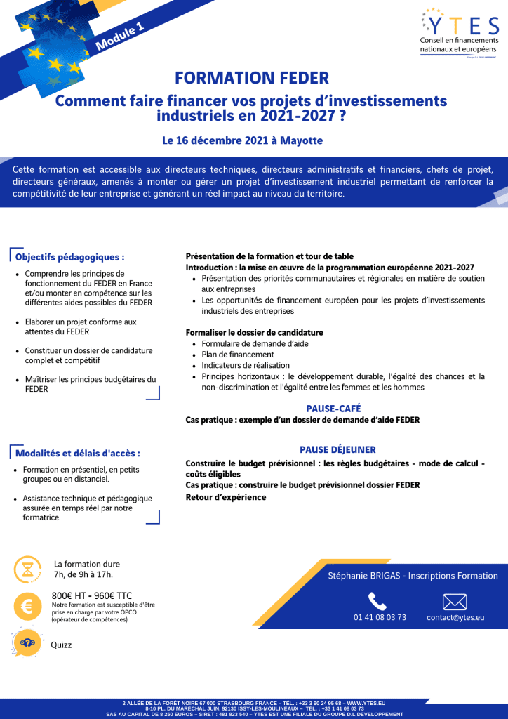 L’ Union européenne met à disposition de nouveaux financements européens pour vos projets. Ytes fait le point sur les subventions mises en place par l’Union Européenne à destination des entreprises au cours d’une formation. Rendez-vous le 16 décembre à 09h00 en vision ou en présentiel sur Mayotte (lieu à définir). Le lien vous sera communiqué après inscription. Découvrez comment monter un dossier de subventions.
