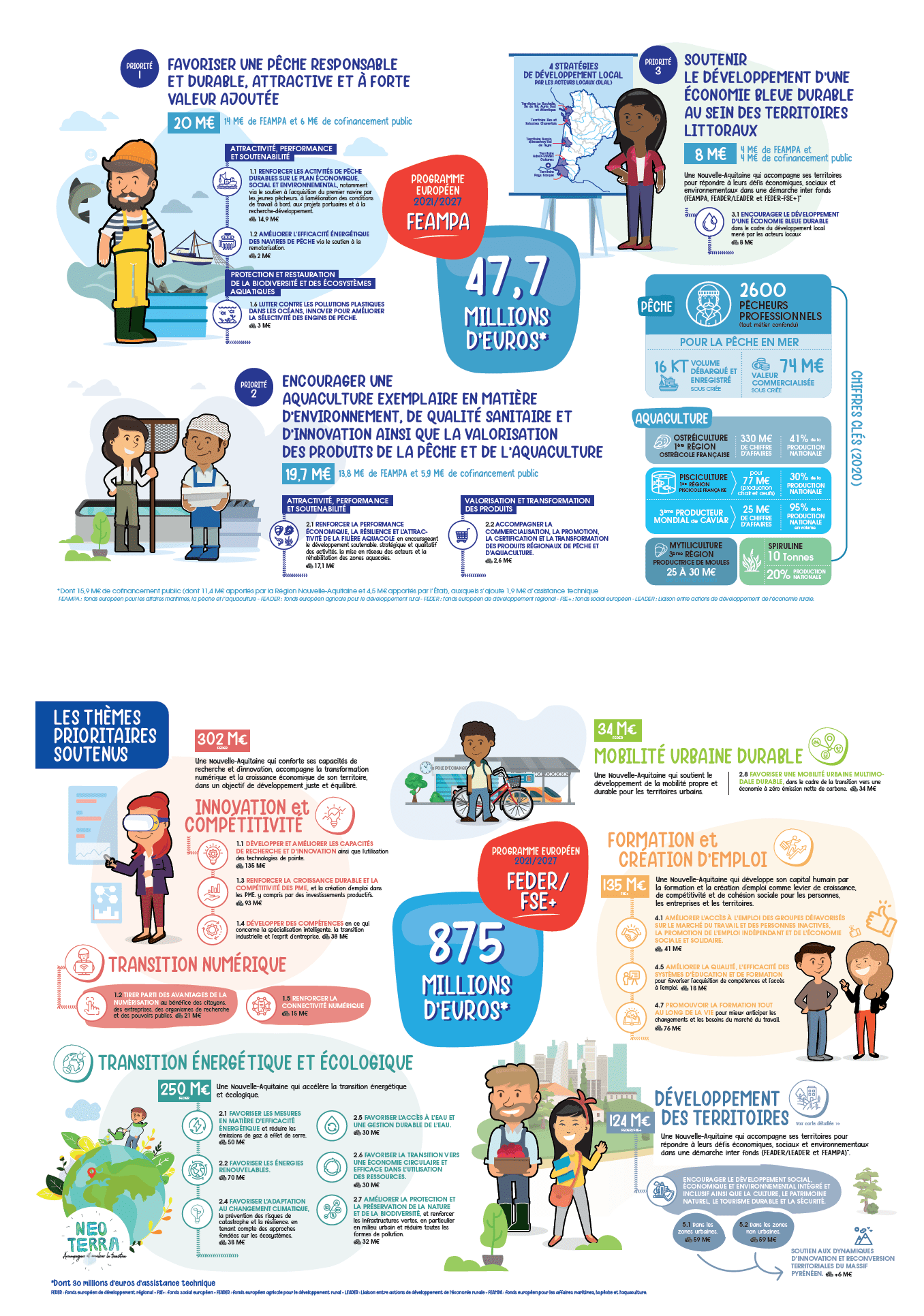 – Le dispositif régional du programme national FEAMPA (Fonds Européen pour les Affaires Maritimes, la Pêche et l’Aquaculture), qui soutient les acteurs de la pêche et de l’aquaculture. Pour 2021-2027, la Région met en œuvre le volet régional du Programme National. L’Europe en Région accompagne les filières pour intégrer les défis environnementaux, de la gestion des déchets aux impacts sur le milieu naturel, tout en restant compétitives. Le budget FEAMPA a augmenté de 15 % en Nouvelle-Aquitaine par rapport à l’enveloppe FEAMP 2014-2020, pour embrasser les enjeux de l’innovation et de l’économie bleue dans les territoires.
